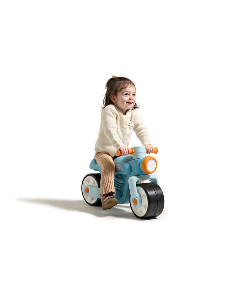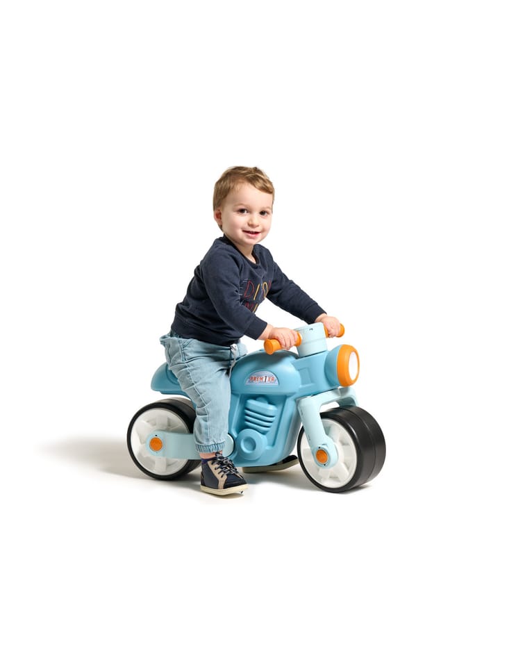 FALK Jeździk Moto Premier to wyjątkowy pojazd w stylu vintage, który łączy w sobie retro design z nowoczesnym wykonaniem. Ten odważny motocykl został zaprojektowany z myślą o najmłodszych użytkownikach, oferując im nie tylko świetną zabawę, ale i pełne bezpieczeństwo. Pojazd jest w 100% wyprodukowany we Francji z wysokiej jakości tworzyw sztucznych pochodzących z recyklingu, co podkreśla dbałość marki o środowisko naturalne. Wyposażony w szerokie, ciche i antypoślizgowe koła, zapewnia doskonałą stabilność, która jest kluczowa podczas nauki utrzymywania równowagi. Dodatkowym atutem są koła typu "whisper", które nie zostawiają śladów na podłodze, dzięki czemu jeździk idealnie nadaje się do użytku zarówno wewnątrz domu, jak i na zewnątrz.