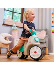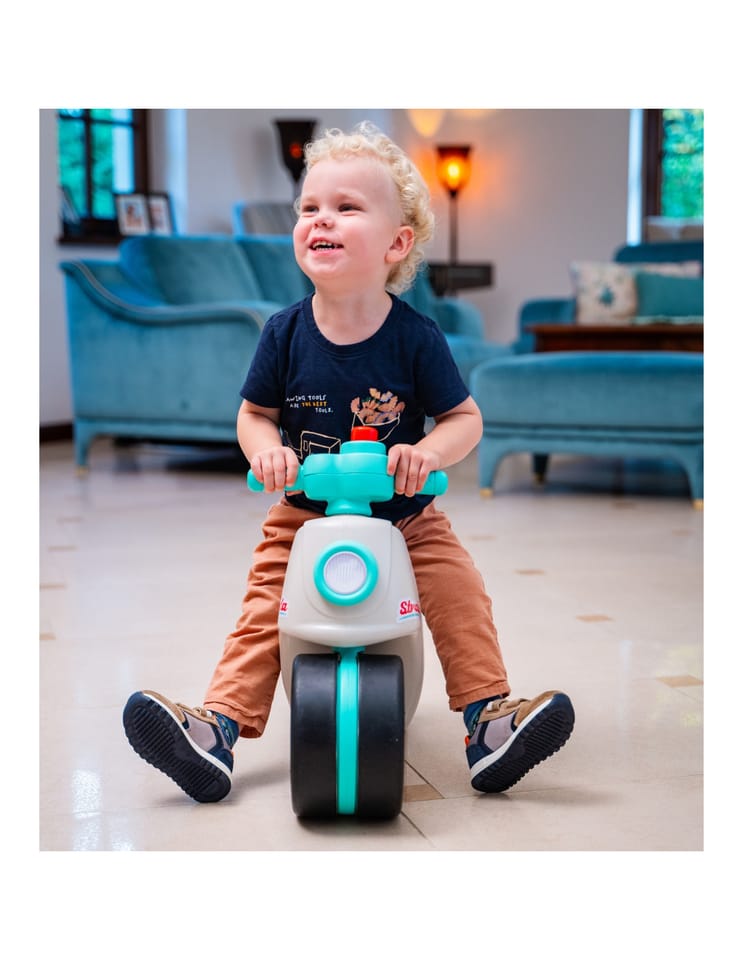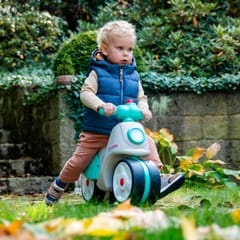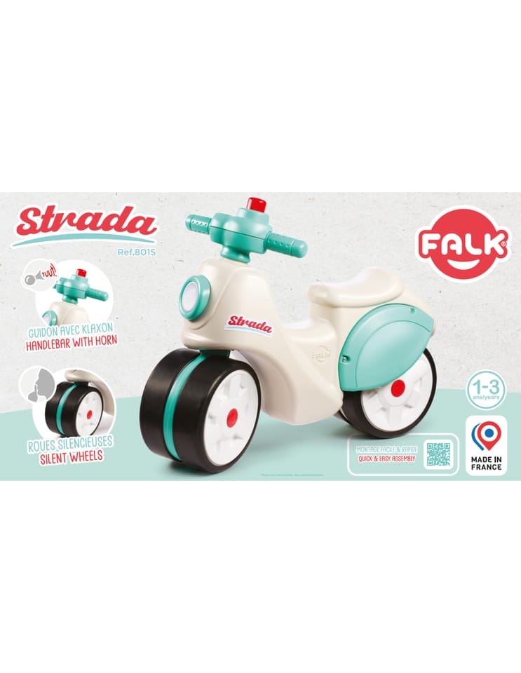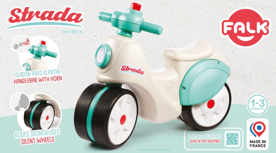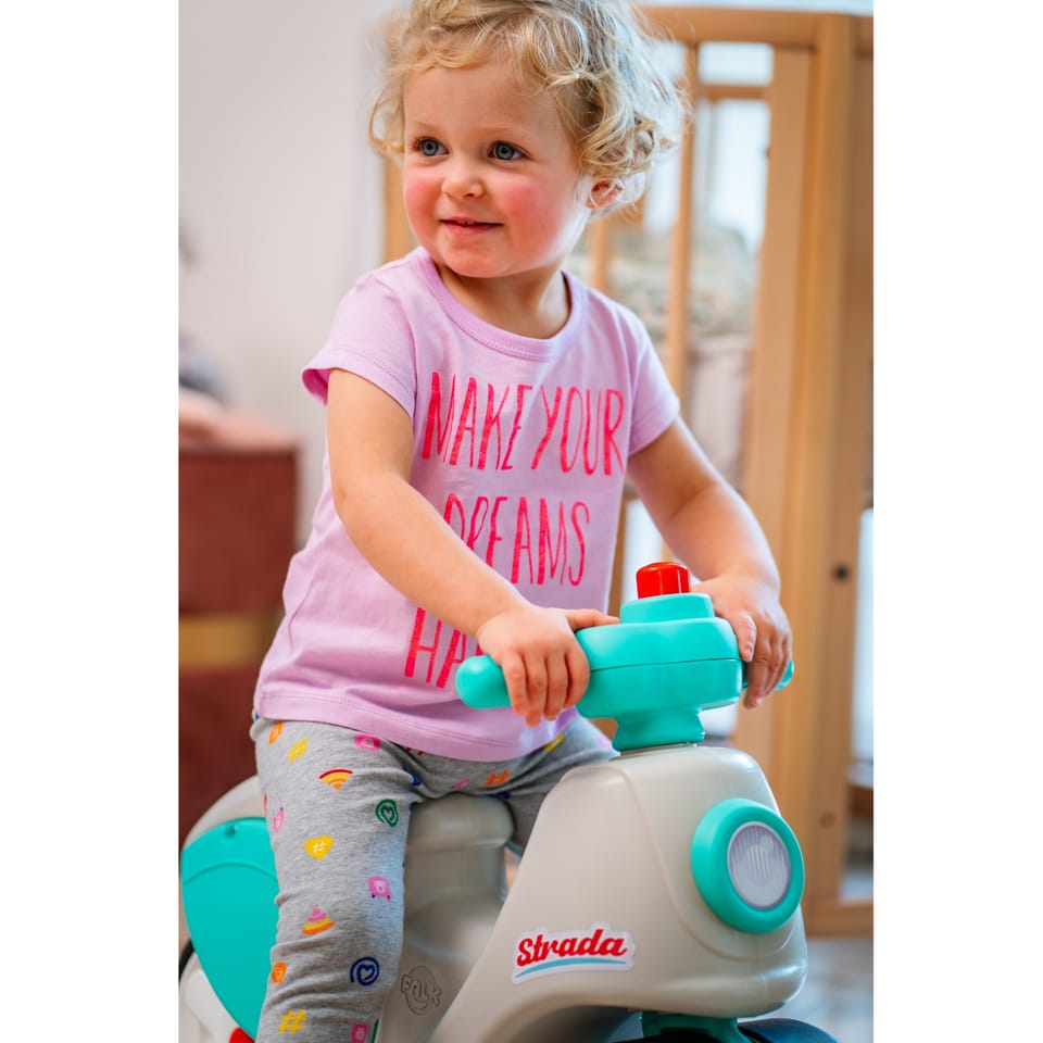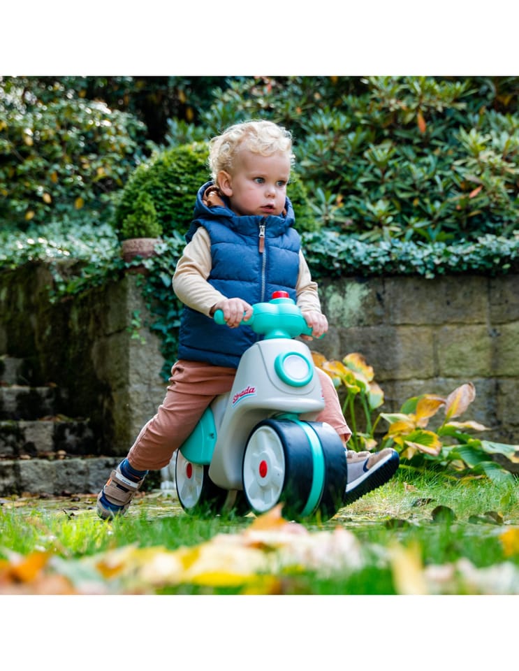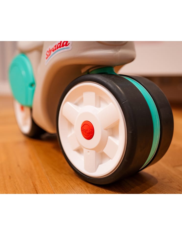 Z tym jeździkiem w stylu Retro, Falk przygląda się swojej historii, aktualizując jedną z jej flagowych zabawek z lat 70. Nowa wersja idealnie pasuje do obecnych czasów dzięki modnym kolorom i wykonaniu. Wyposażona w duże kółka zapewniające dziecku niezbędną stabilność do rozwoju, dodatkowo twój maluch ćwiczy równowagę i zdolności motoryczne. Ich powłoka elastomerowa sprawia że są bardziej odporne na zarysowania czy inne uszkodzenia. Jeździk prowadzi się jak prawdziwy skuter dzięki skrętnej kierownicy, która jest niewielka i zawiera klakson, który dodatkowo wzbogaca zabawę dziecka.