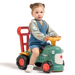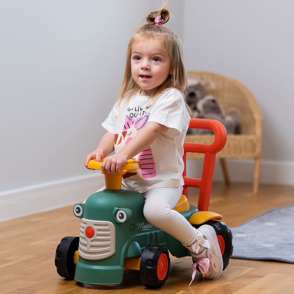 Maurice to uroczy traktorek francuskiej marki Falk, który będzie towarzyszem pierwszych kroków Twojego dziecka. Jasne kolory i zaokrąglone kształty zachwycą każdego malucha. Uruchamianie traktora za pomocą małego pokrętła dźwiękowego oraz dźwięk z klaksonu umieszczonego na kierownicy to wspaniała pierwsza nauka, która pobudzi umiejętności motoryczne i słuch Twojego dziecka. Jeżdżąc na jeździku, bawiąc się kierownicą z klaksonem i skrętnymi kołami dziecko będzie ćwiczyło koordynację i równowagę. Stojąc z tyłu, może korzystać z ergonomicznego oparcia, aby uczyć się chodzić przez zabawę, bez strachu i całkowicie bezpiecznie. Pod siedzeniem znajduje się niewielki schowek do przechowywania skarbów.