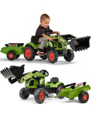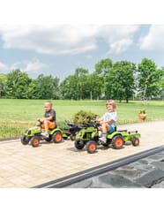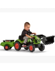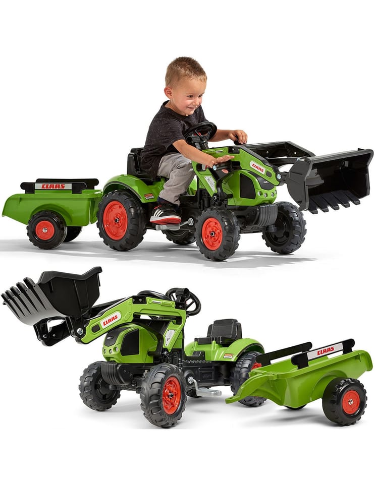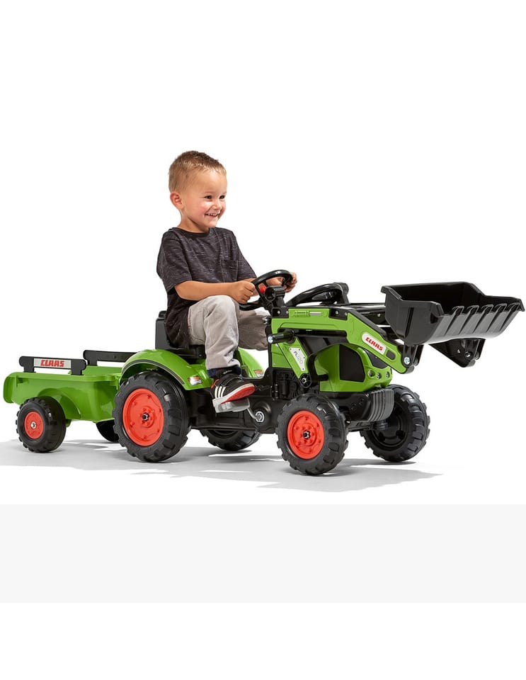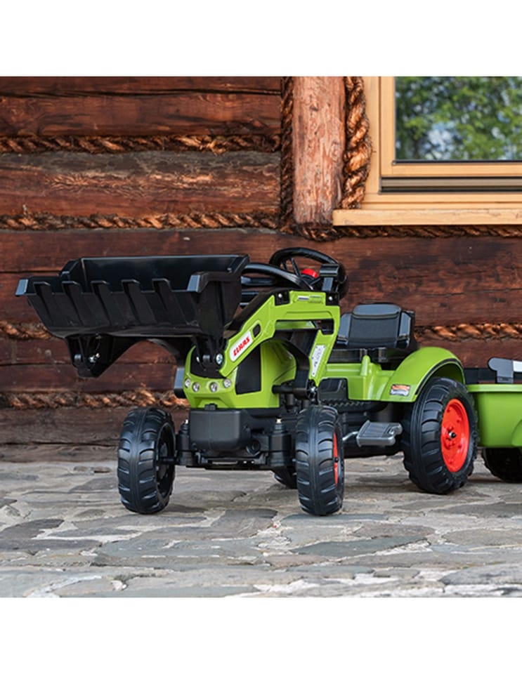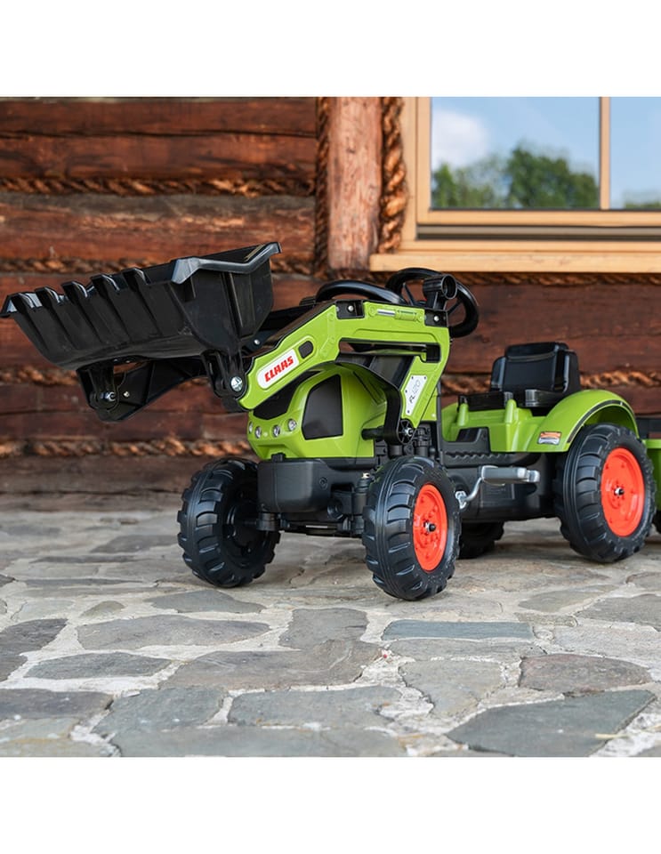 Traktor na pedały Claas Arion 410 od marki FALK to wierna replika prawdziwego ciągnika, stworzona z myślą o małych rolnikach w wieku od 2 do 5 lat. Pojazd ten, wyprodukowany we Francji, zachwyca jakością wykonania i dbałością o detale, będąc idealnym odwzorowaniem modelu Claas Arion 410. Traktor wyposażony jest w funkcjonalną przednią łyżkę (ładowarkę), która pozwala na nabieranie i przenoszenie piasku czy ziemi. Dodatkową atrakcją jest dołączona przyczepa z burtami, umożliwiająca transport większych ładunków. Całość dopełnia kierownica z klaksonem oraz charakterystyczny pałąk bezpieczeństwa za siedziskiem.