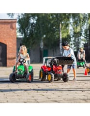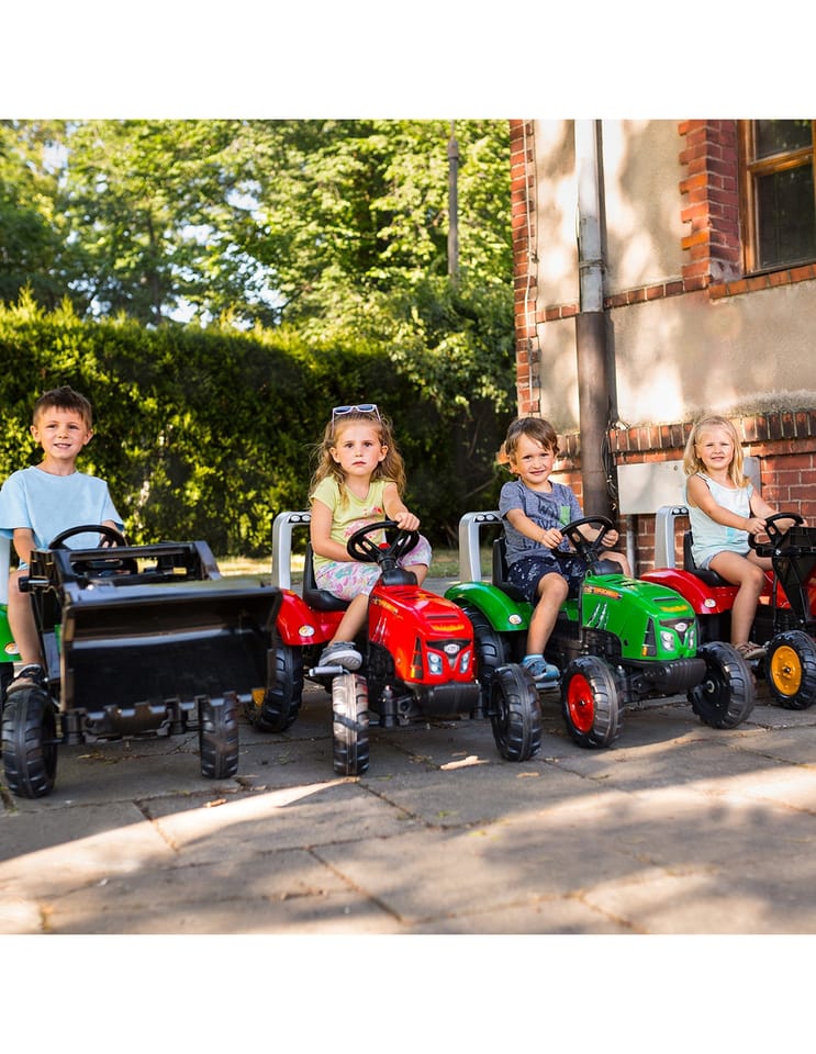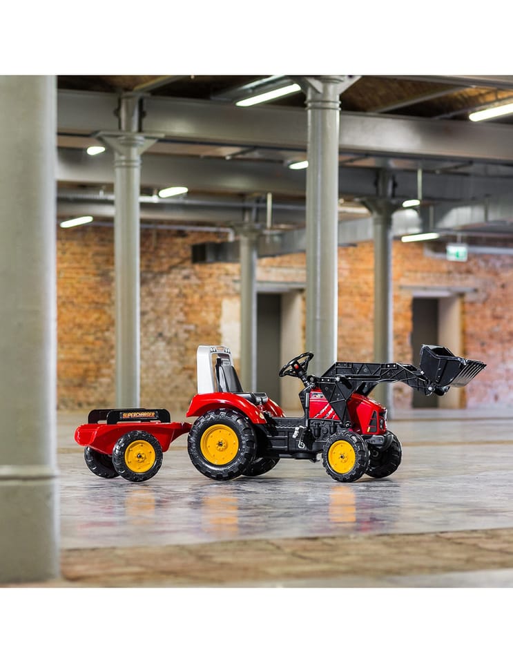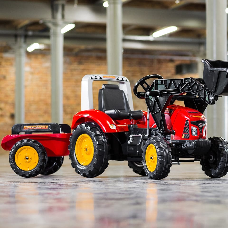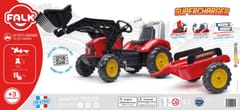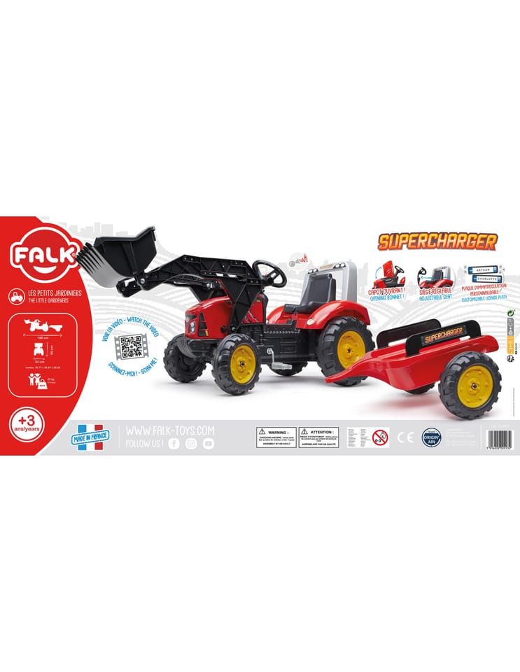 FALK Traktor na pedały z przyczepą Red Supercharger FALK to spełnienie marzeń niejednego małego traktorzysty. Starannie wykonany, z dbałością o najmniejszy szczegół! Żaden Farmer by takim nie pogardził. Pojazd wykonany z najwyższej jakości tworzywa przeznaczony dla dzieci w wieku od 3 lat. Pojazd jest wyposażony w przednią łyżkę oraz odpinaną przyczepę z panelami i kierownicę z klaksonem. Koła traktorka zostały wykonane z wysokiej jakości plastiku. Traktor posiada również otwieraną maskę z imitacją prawdziwego silnika.Charakterystyka: