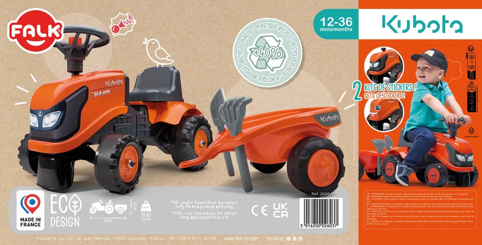 Traktorek Jeździk Kubota z przyczepką marki Falk to spełnienie marzeń niejednego małego traktorzysty. Starannie wykonany, z dbałością o najmniejszy szczegół! Żaden prawdziwy Farmer by takim nie pogardził. Pojazd wykonany z najwyższej jakości tworzywa przeznaczony dla dzieci od 12 miesiąca życia. Pojazd jest wyposażony odpinaną przyczepę z panelami oraz kierownicę z klaksonem. Koła traktorka zostały wykonane z wysokiej jakości plastiku. Dodatkowo do traktorka mamy do zabawy dla naszej pociechy grabki oraz łopatkę. Dołączone do traktorka naklejki pozwolą dziecku wybrać swój unikatowy styl. Uśmiechnięta buźka czy standardowa naklejka? Zaskocz wszystkich i naklej na przód pojazdu.