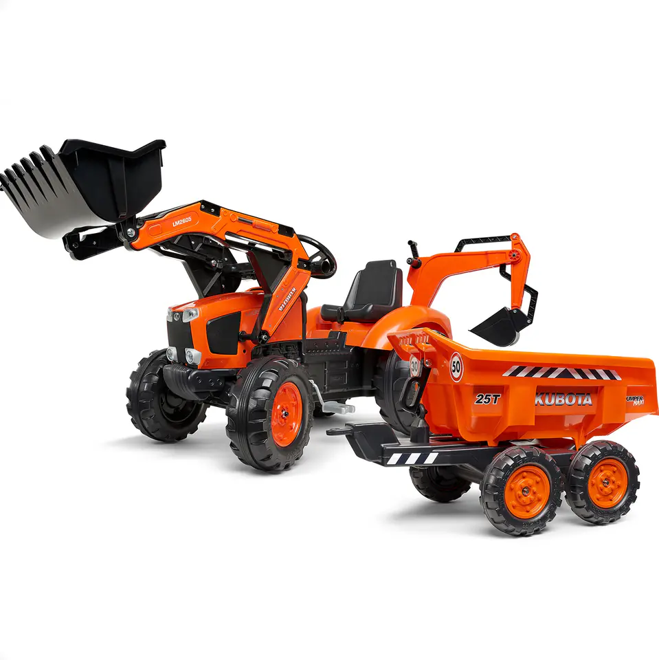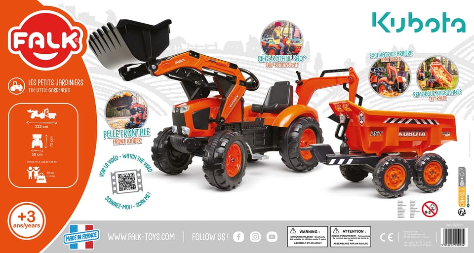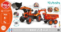 Traktor KUBOTA z Przyczepą producenta FALK to spełnienie marzeń niejednego małego traktorzysty. Starannie wykonany, z dbałością o najmniejszy szczegół !!! Żaden Farmer by takim nie pogardził. Pojazd na pedały - idealny prezent dla każdego malucha. Najnowszy traktor Kubota na pedały dla dzieci z łyżką, ładowarką i przyczepą wykonany jest z wysokiej jakości tworzywa sztucznego. Posiada obracany fotel. Pojazd przeznaczony jest dla dzieci w wieku od 3 lat. Każdy młody traktorzysta pokocha ten model. Pojazd wykonany jest w oryginalnej kolorystyce firmy. Produkty firmy FALK to wysoka jakość, dbałość o szczegóły i solidna konstrukcja!