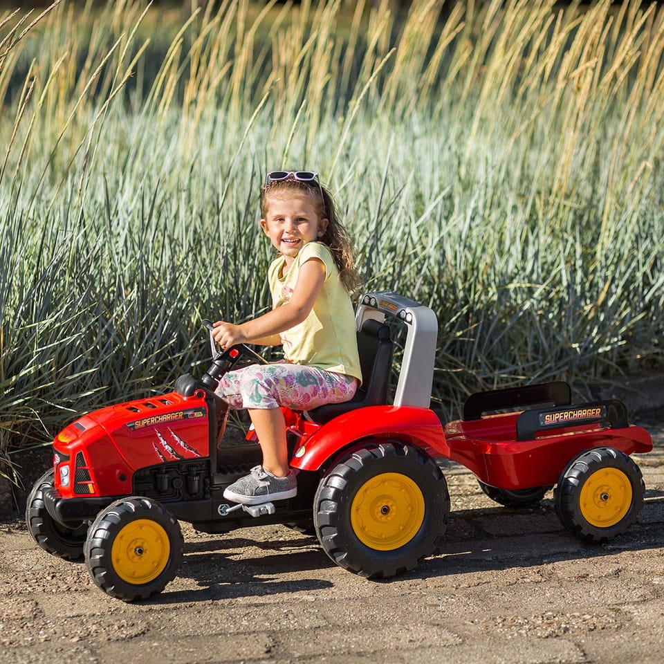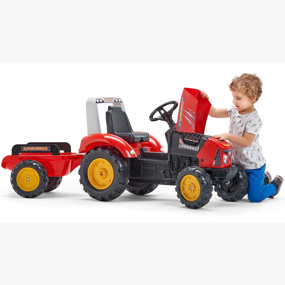 Traktor na pedały z przyczepą Red Supercharger producenta FALK to spełnienie marzeń niejednego małego traktorzysty. Starannie wykonany, z dbałością o najmniejszy szczegół! Żaden Farmer by takim nie pogardził. Pojazd wykonany z najwyższej jakości tworzywa przeznaczony dla dzieci w wieku od 3 lat. Pojazd jest wyposażony w odpinaną przyczepę z panelami oraz kierownicę z klaksonem. Koła traktorka zostały wykonane z wysokiej jakości plastiku. Traktor posiada również otwieraną maskę z imitacją prawdziwego silnika.