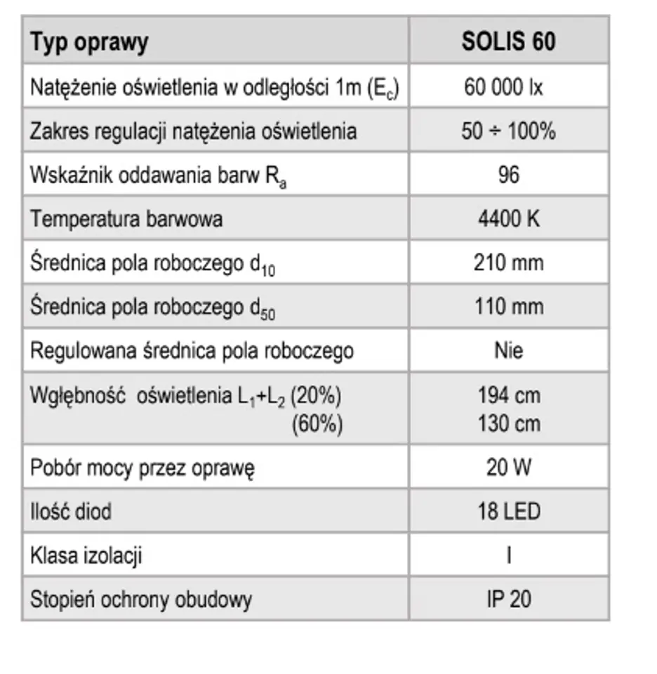 Natężenie światła z odległości 1m to 60 000 lux. Lampy zabiegowe serii SOLIS 60 są przeznaczone do stosowania jako podstawowe źródło oświetlenia w diagnostyce i przy zabiegach w gabinetach lekarskich i zabiegowych, ale także w precyzyjnych operacjach intensywnej terapii, salach dla rekonwalescencji oraz oddziałach pierwszej pomocy.