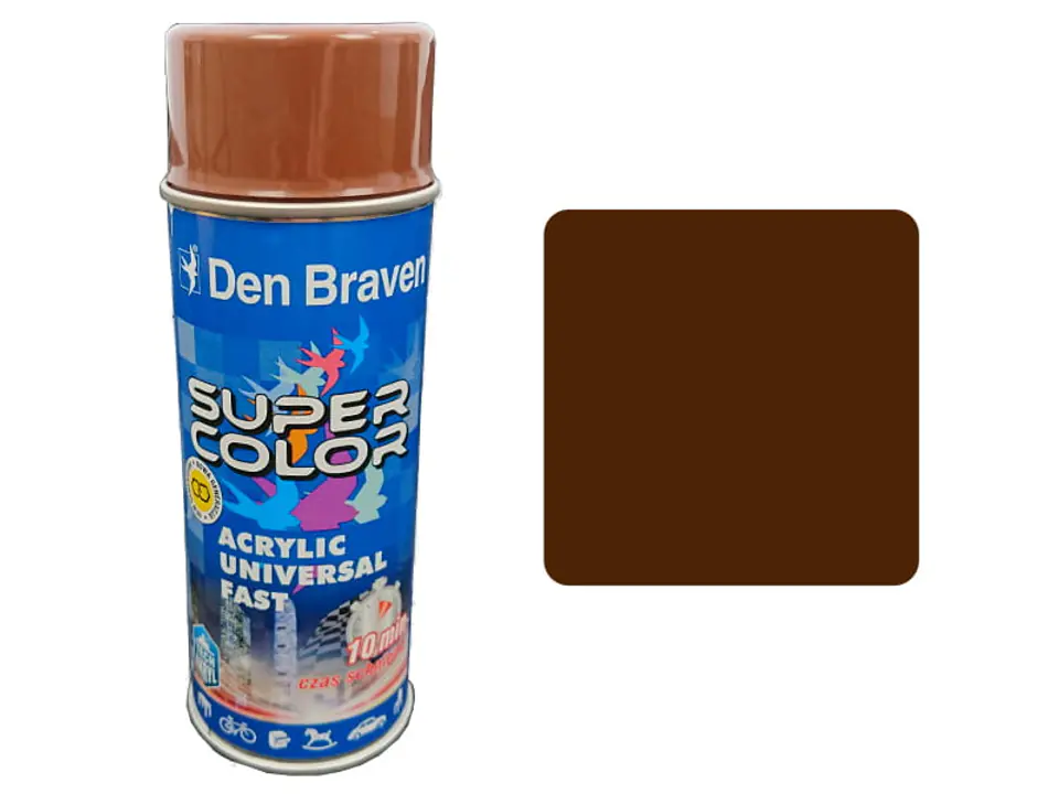 Lakier akrylowy w sprayu Super Color Acrylic Universal Fast. Krótki czas schnięcia - 10 minut. Pojemność 400ml, kolor brązowy (RAL 8011)