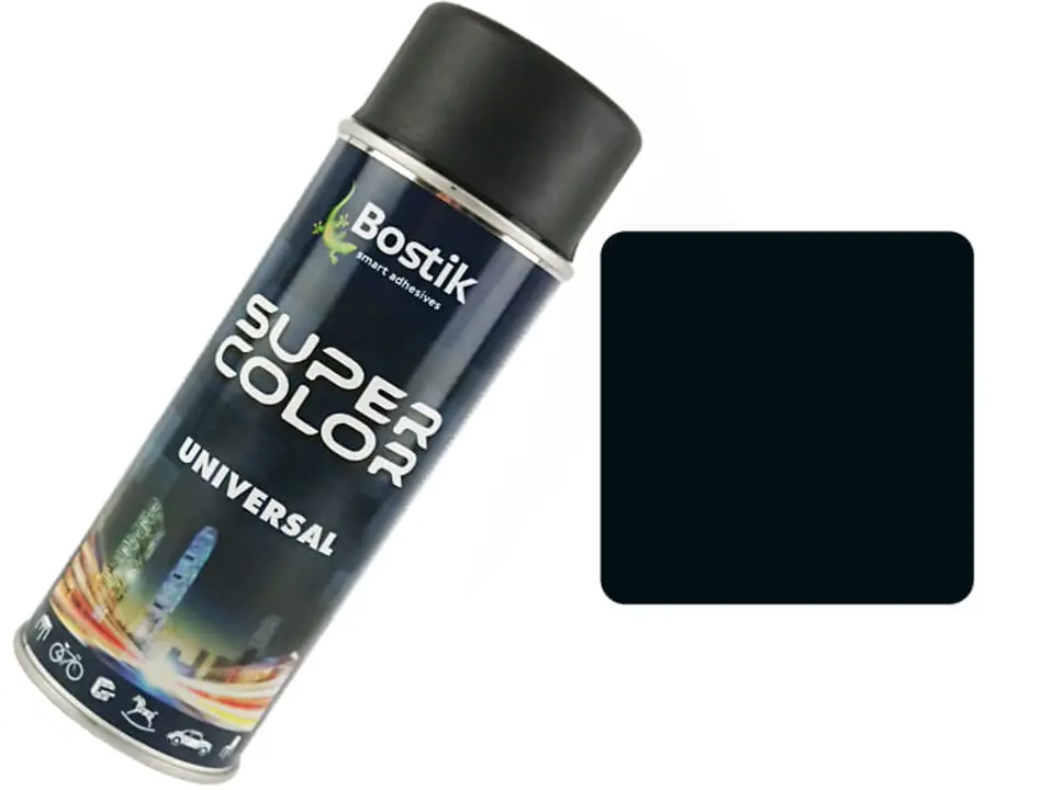 Lakier syntetyczny alkidowy Super Color Universal o uniwersalnym przeznaczeniu 400ml. Kolor czarny matowy (RAL 9005).