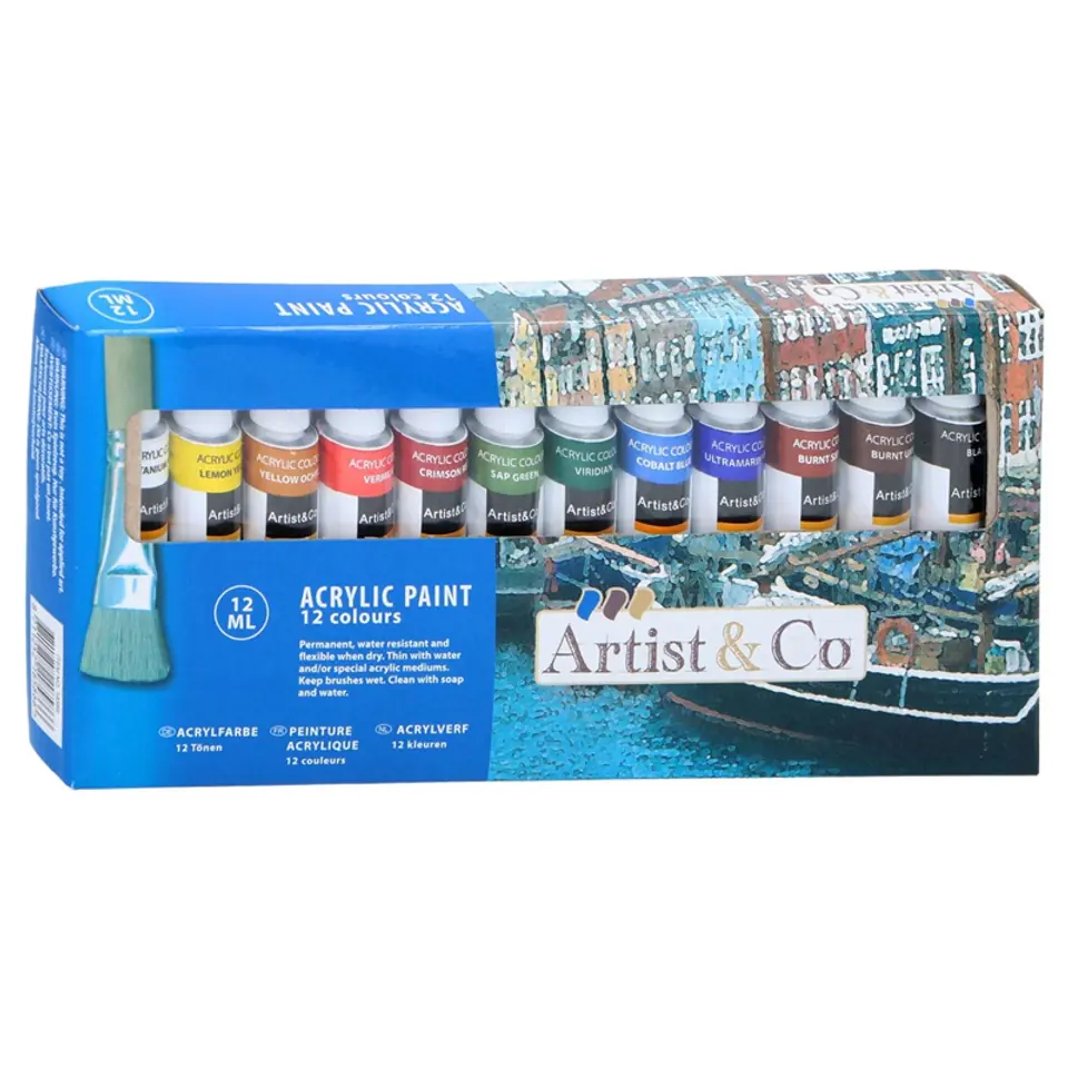 Zestaw farb akrylowych – 12 sztuk w oddzielnych tubkach.Zapakowane w pudełko.