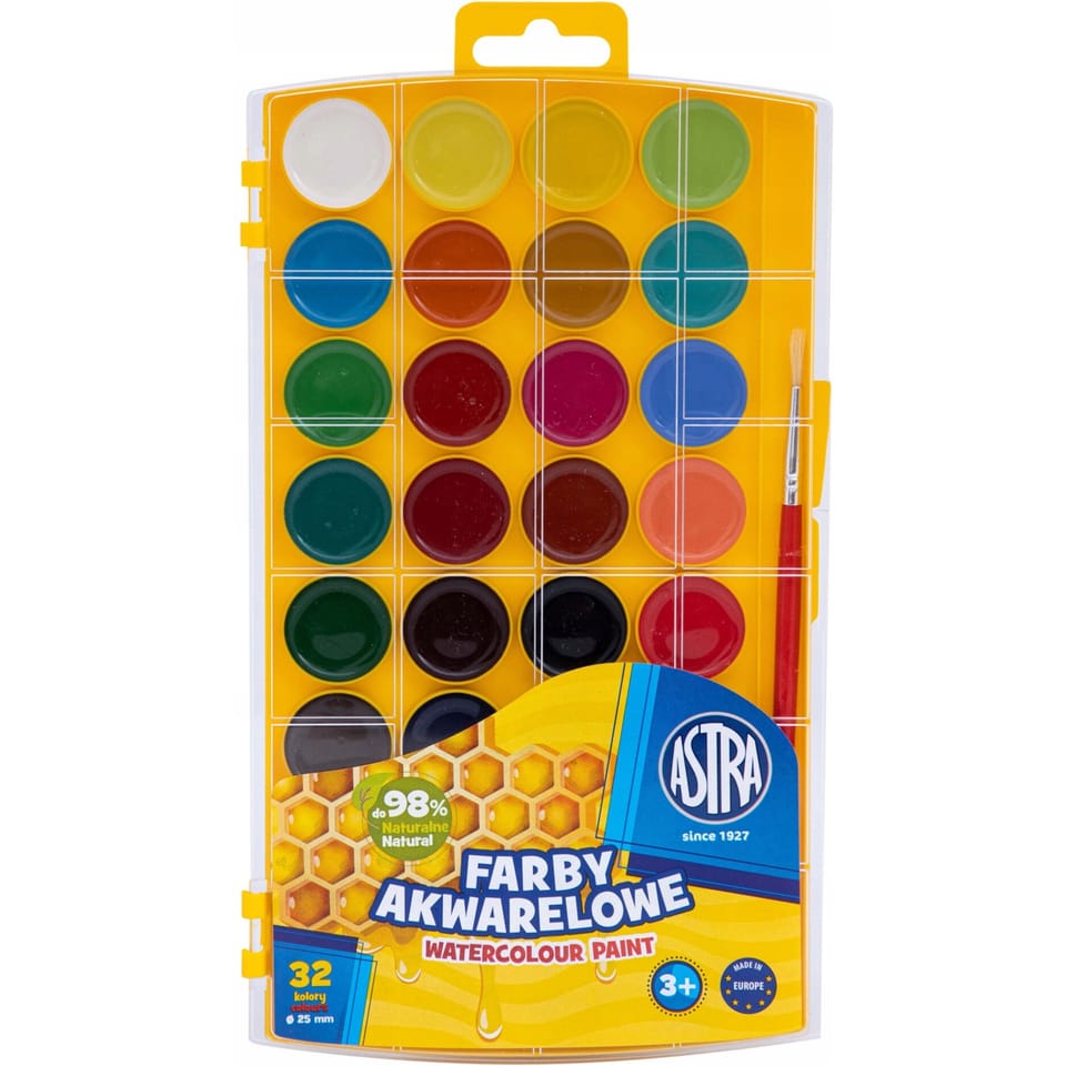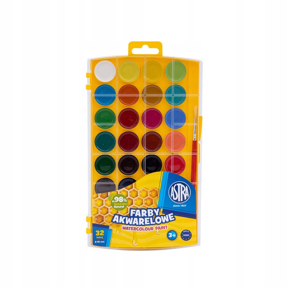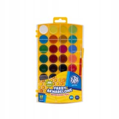 Farby akwarelowe szkolne zestaw 32 kolory + pędzelek 302023002 ASTRA Farby akwarelowe Astra to wysokiej jakości farby wodorozcieńczalne gwarantujące żywe i intensywne kolory.
