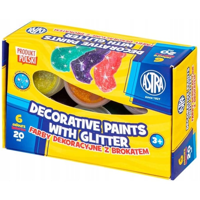 Farby dekoracyjne Astra z brokatem 6 kol x 20 mlNajważniejsze zalety Farby dekoracyjne Astra z brokatem 6 kol x 20 ml: