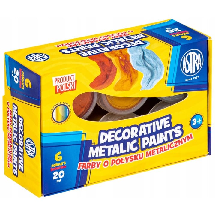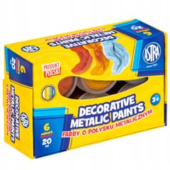 Farby dekoracyjne metalic marki Astra. Farby dedykowane do wszelkich prac zdobniczo – dekoracyjnych. Świetnie kryją powierzchnię, które wchłaniają wodę, np. papier, masa papierowa, ceramika, karton czy drewno. Kolory nie przenikają się, dzięki czemu mogą być swobodnie nanoszone tuż obok siebie.Cechy: