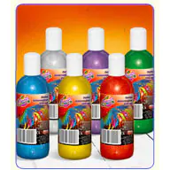 Farby są nietoksyczne, wodorozcieńczalne, o wysokiej jakości krycia, doskonałej przyczepności, posiadają aktualne badania TUV zgodnie z aktualnym rozporządzeniem Ministra Gospodarki oraz certyfikat bezpieczeństwa CE. Opakowanie zawiera 6 kolorów w butelach po 250 ml.