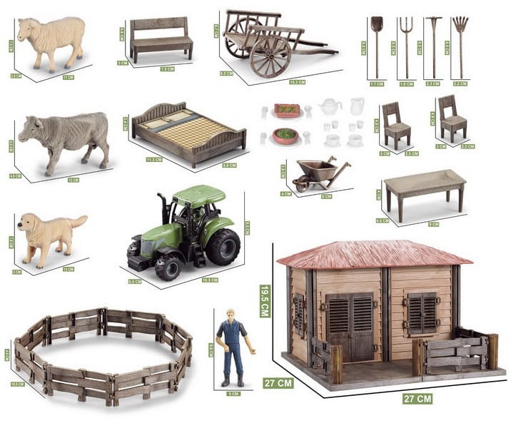 | - domek rolnika, - łóżko, - stół, - 2 x krzesło, - ławka, - wózek ręczny, - taczki, - traktor, - zagroda, - piesek, - figurka rolnika, - krówka, - owieczka, - 2 x doniczka ze spodkiem, - 2 filiżanki, - 2 podstawki, - dzbanek, - 2 łyżki, - 2 widelce. - 4 x narzędzia rolnicze, - młotek. |