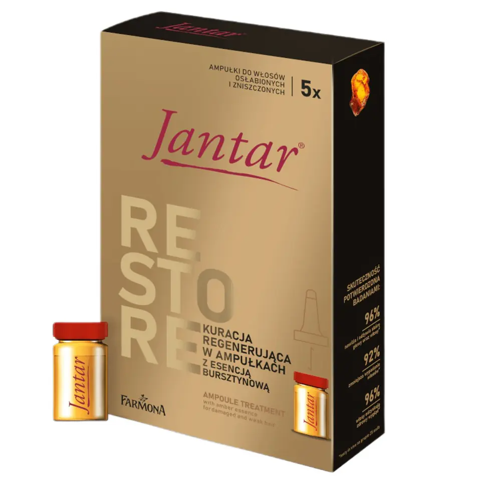 Farmona Jantar kuracja w ampułkach z esencją bursztynową do włosów bardzo zniszczonych i osłabionych 5x5ml (P1)5900117978603Bogata w składniki aktywne receptura gwarantuje spektakularne efekty.nbspWyciąg z bursztynu odżywia i wzmacnia strukturę włosów, poprawiając ich kondycję. Proteiny jedwabiu nadają włosom elastyczność, miękkość i połysk. Glukoza oraz witaminy A, E i F nawilżają, intensywnie odżywiają i wzmacniają włosy. Kompleks AHA delikatnie zmiękcza naskórek, ułatwiając wnikanie substancji aktywnym, a Trichogen® stymuluje wzrost i przedłuża cykl życia włosa.Składniki aktywne:-nbspEsencja bursztynowanbsp- pielęgnuje, odżywia i wzmacnia strukturę włosów, poprawiając ich kondycję.-nbspProteiny jedwabiunbsp- nadają włosom elastyczność, miękkość i połysk.-nbspGlukoza oraz witaminy A, E i Fnbsp- nawilżają, intensywnie odżywiają oraz wzmacniają.-nbspKompleks AHAnbsp- delikatnie zmiękcza naskórek, ułatwiając wnikanie substancjom aktywnym.-nbspTrichogen®nbsp- stymuluje wzrost i przedłuża cykl życia włosa.Efekty:nbspwzmocnione cebulki włosów, odżywione, zregenerowane i grubsze pasma. Przywrócona witalność, naturalny połysk i zdrowy wygląd włosów.Sposób użycia:nbspZawartość ampułki nanieść na skórę głowy i wykonać około 2 minutowy masaż. Nie spłukiwać. Stosować po każdym myciu głowy jako kurację, aż do momentu uzyskania widocznej poprawy stanu włosów, a następnie dla podtrzymania efektów raz w tygodniu. Najlepsze rezultaty przynosi systematyczne stosowanie ampułek wraz z pozostałymi produktami z linii Jantar do włosów zniszczonych i osłabionych.