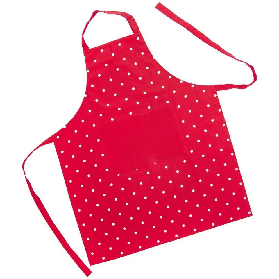 - BAWEŁNIANY - Bawełniany, wiązany fartuch kuchenny w czerwonym kolorze z linii TECKA. Posiada efektowane zdobienie w postaci białych kropek. Stylowy fartuch będzie ciekawym elementem ochronnym i ozdobnym odzieży w kuchni. Fartuch kuchenny o wymiarach 71 x 86 cm.