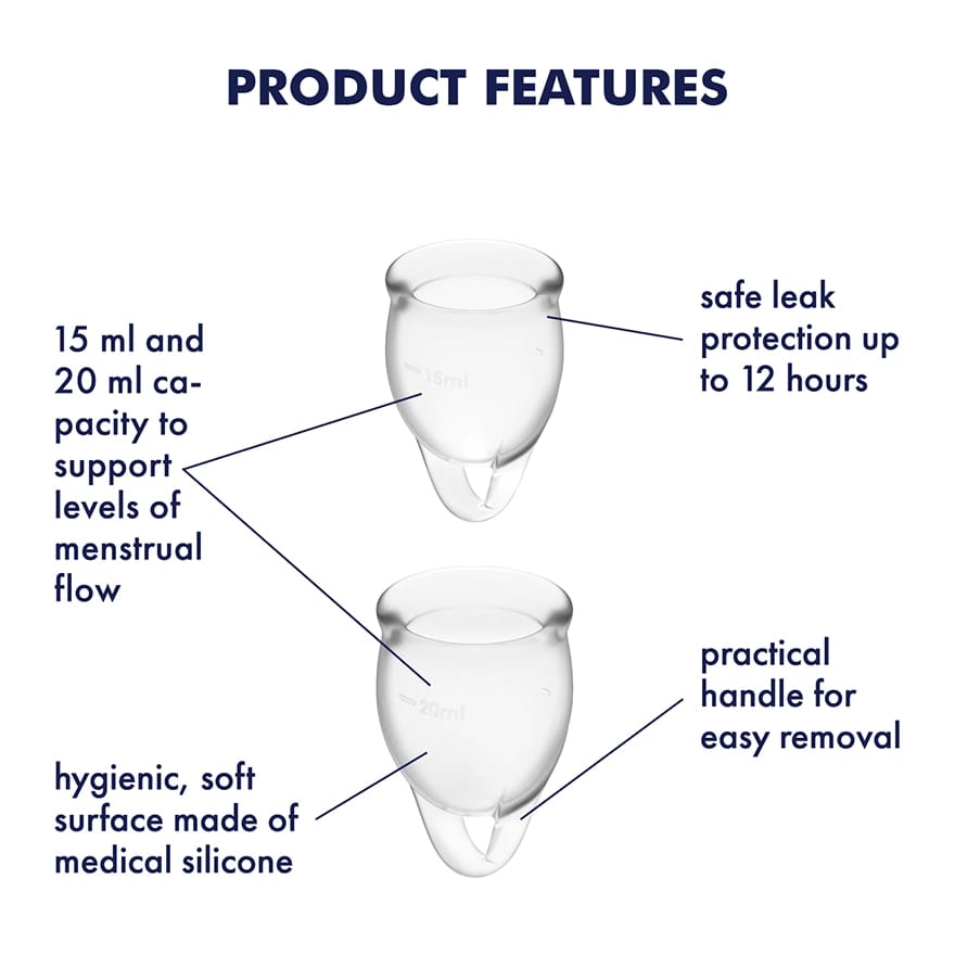 Zestaw kubeczków menstruacyjnych o pojemność 15 ml i 20 ml. Wykonane zostały z silikon klasy medycznej i nadają się do wielokrotnego użytku, wystarczy dokładnie wyczyścić je po każdym użyciu zanurzając we wrzącej wodzie.