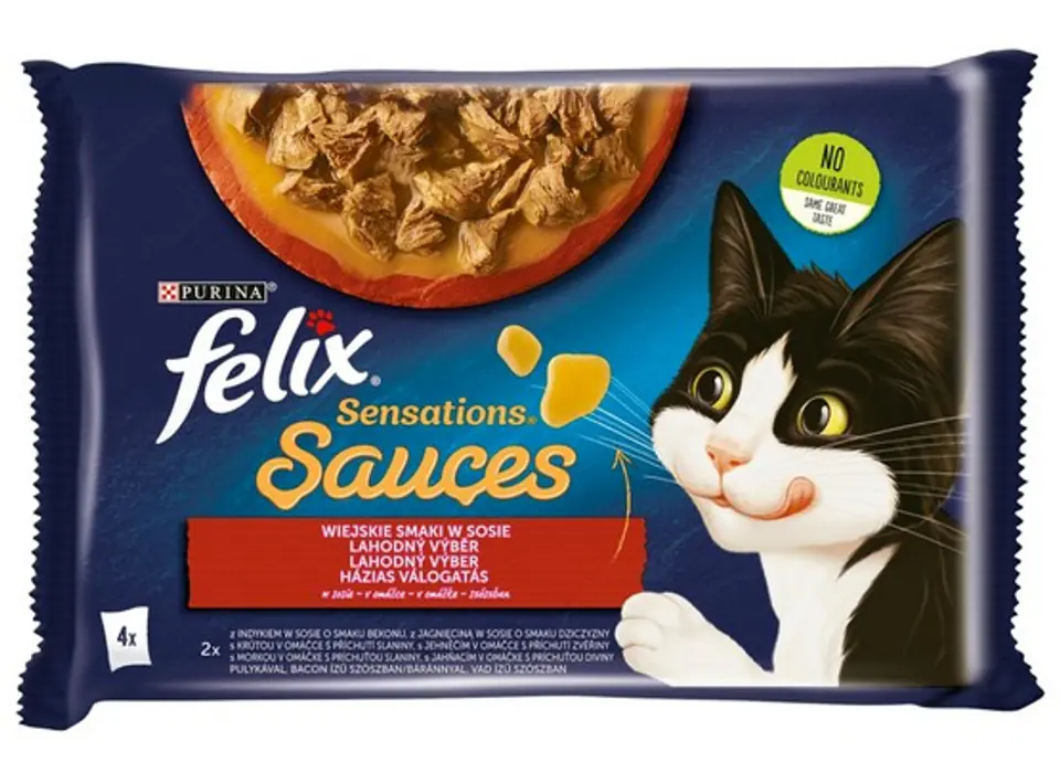 Felix Sensations Sauces to linia pysznych posiłków, stworzonych z delikatnych mięsnych lub rybnych kąsków zanurzonych w różnorodnych aromatycznych sosach, które zaskoczą smakiem każdego kota. Te dania wyglądają, pachną i smakują tak dobrze, że Twój kot nie będzie mógł im się oprzeć. A to nie wszystko! Te pyszne posiłki są pełne wartości odżywczych, aby w 100% zaspokoić dzienne potrzeby Twojego kota przy podawaniu zgodnie z zaleceniami na opakowaniu.