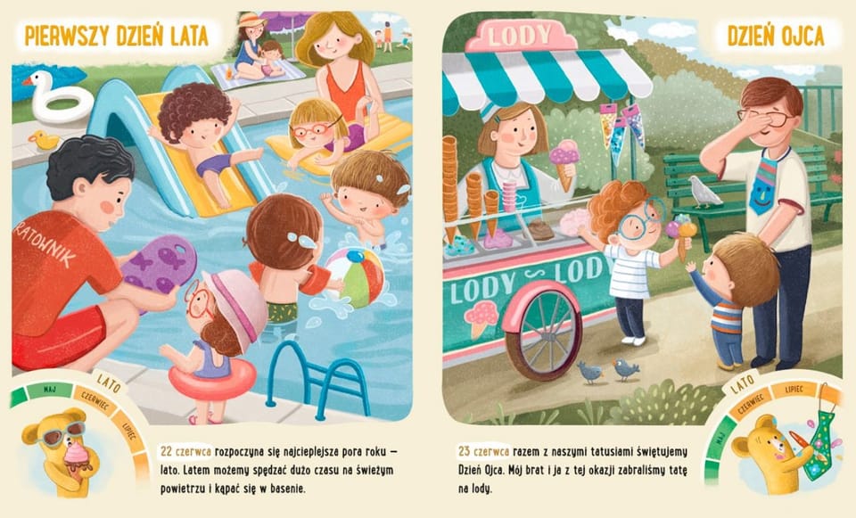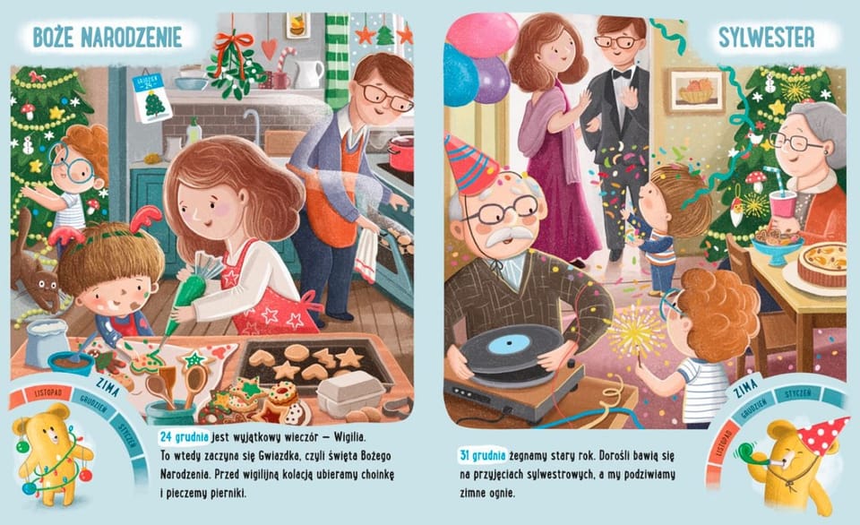 Jakie mamy pory roku? W jakiej kolejności następują po sobie miesiące? Kiedy obchodzimy różne święta?Dziecko uczy się tego wszystkiego dzięki obserwacji zmian zachodzących w przyrodzie oraz przeżywaniu wyjątkowych okazji i świąt. Dlatego w najnowszym tomie Feluś i Gucio uczestniczą w rozmaitych uroczystościach. Są tu opisy świąt ludowych, religijnych, państwowych, przedszkolnych i zupełnie prywatnych, a koło czasu pokazuje nazwę miesiąca, na który przypada dane wydarzenie.Katarzyna Kozłowska absolwentka pedagogiki specjalnej na Uniwersytecie Adama Mickiewicza oraz edukacji artystycznej na Uniwersytecie Artystycznym w Poznaniu. Nauczycielka wychowania przedszkolnego, autorka książek Feluś i Gucio idą do przedszkola, Feluś i Gucio wiedzą, jak się zachować, Feluś i Gucio poznają emocje, Feluś i Gucio poznają zawody. Stara się pomagać maluchom i ich rodzicom w radosnym i bezstresowym rozpoczęciu przygody z przedszkolem.Marianna Schoett ilustratorka książek dla dzieci. Ukończyła Państwowe Liceum Sztuk Plastycznych w Bydgoszczy, a następnie kontynuowała naukę na Wydziale Sztuk Pięknych UMK w Toruniu. Rysowanie ilustracji dla dzieci to jej hobby, któremu całkowicie poświęca czas wolny. Na co dzień pracuje w agencji kreatywnej.Powyższy opis pochodzi od wydawcy.