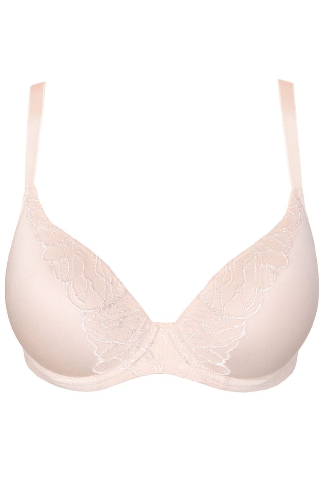 - Biustonosz z gładkimi miseczkami modelowanymi termicznie ozdobionymi kwiatową koronką w centrum delikatnie unosi biust,