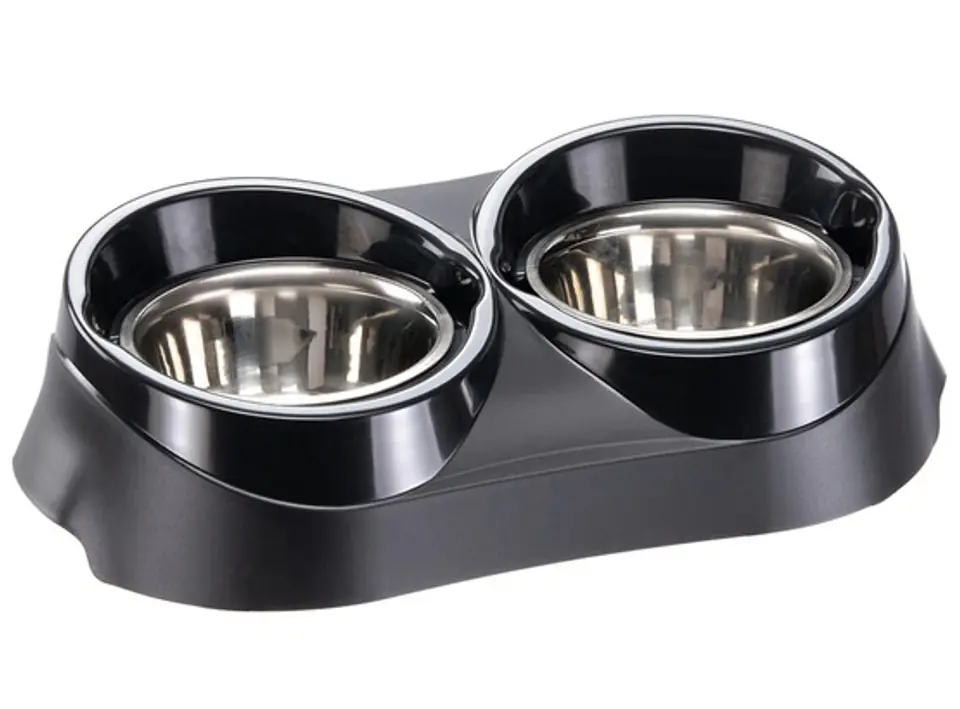 Zestaw pełni rolę podwójnej miski - plastikowa podstawa z dwoma wgłębieniami na miski ze stali nierdzewnej. Uchwyt (podstawka) na miski jest antypoślizgowy i ergonomicznie wyprofilowany.