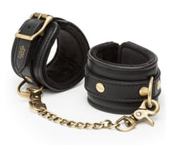 Odkryj wyrafinowaną linię akcesoriow Fifty Shades of Grey Bound to You! Ten model kajdanek na nadgarstki to propozycja dla osob ceniących wysoką jakość wykonania oraz stylowy design. Wykonane są z miękkiej, ręcznie wyściełanej ekoskory, ktora gwarantuje komfort użytkowania i trwałość. Subtelne, antyczne złote okucia nadają im wyjątkowego charakteru, a solidny D-ring oraz odpinany łańcuszek z karabińczykiem zapewniają wszechstronność zastosowania.