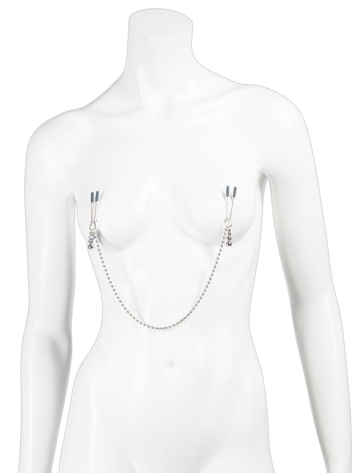 Końcowki zostały pokryte miękką powłoką silikonową, co chroni skorę i zapobiega otarciom, gwarantując wygodę nawet przy dłuższym użytkowaniu. Zaciski połączone są ozdobnym, metalowym łańcuszkiem, ktory dodaje całości elegancji oraz pozwala na rożnorodne zastosowania, w tym możliwość doczepienia dodatkowych akcesoriow.