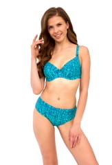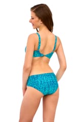 Klasyczne figi w kolorze turkusowym z wyższym stanem, który optycznie spłaszcza brzuch, ukrywając niedoskonałości sylwetki. Skład surowcowy: 85% Poliamid, 15% Elastan