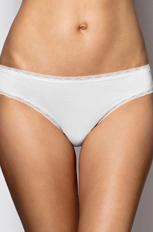 Klasyczne, mięciutkie figi damskie wykonane z delikatnego i miłego w dotyku modalu połączonego z elastanem. Zdobione subtelną koronką na brzegach. Gładkie, wysoce komfortowe, bardzo kobiece. W zestawie od razu 2 sztuki, obie białe. Skład: 95% modal, 5% elastan.