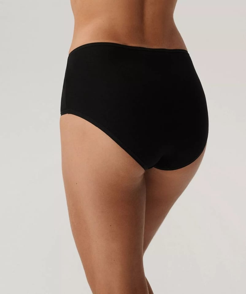 Figi z wysokim stanem oraz szerokim bokiem, otulają ciało i dają poczucie swobody ruchów. Delikatna, wąska guma sprawia, że bielizna nie uciska i nie podrażnia. Skład: 95% bawełna, 5% elastan.