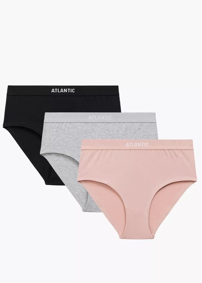Majtki o sportowym fasonie z wysokim stanem (do pępka), szerokimi bokami i zabudowanym tyłem. W pasie wykończone są miękką gumą zewnętrzną z logo ATLANTIC. W opakowaniu 3 szt. Skład: 95% bawełna, 5% elastan.
