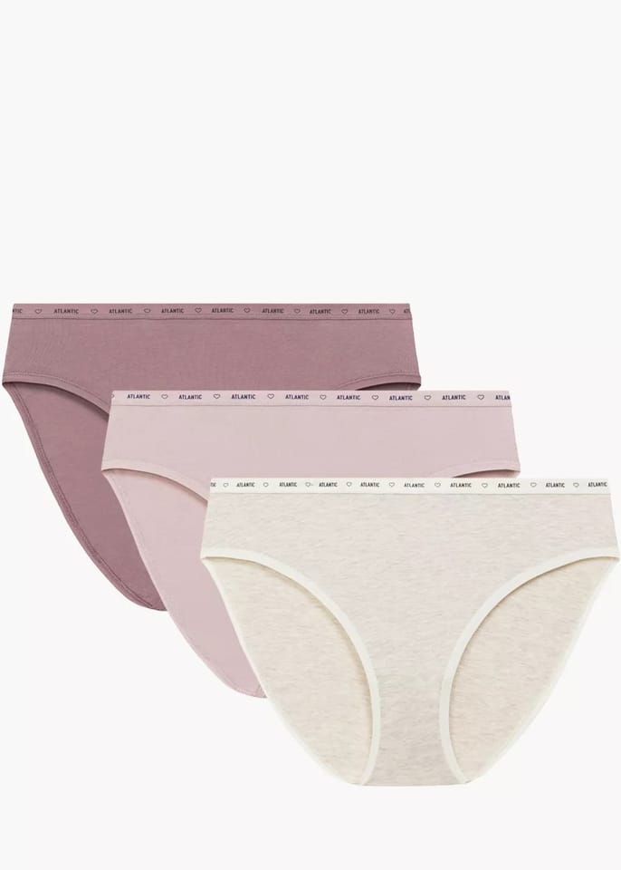 Bielizna odznacza się wysoką talią, zaznaczoną miękką i nieuciskającą ciała lamówką, ozdobioną napisami Atlantic oraz serduszkami, dość mocno wyciętymi bokami i zabudowanym tyłem. W opakowaniu 3 szt. Skład: 90% bawełna, 10% elastan.