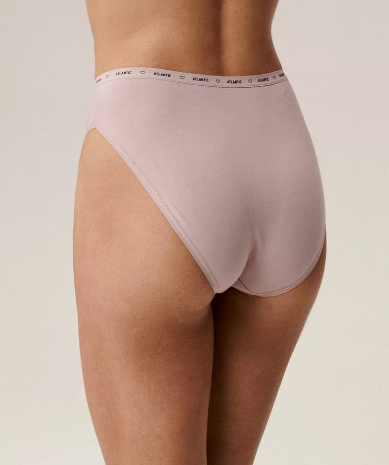 Bielizna odznacza się wysoką talią, zaznaczoną miękką i nieuciskającą ciała lamówką, ozdobioną napisami Atlantic oraz serduszkami, dość mocno wyciętymi bokami i zabudowanym tyłem. W opakowaniu 3 szt. Skład: 90% bawełna, 10% elastan.