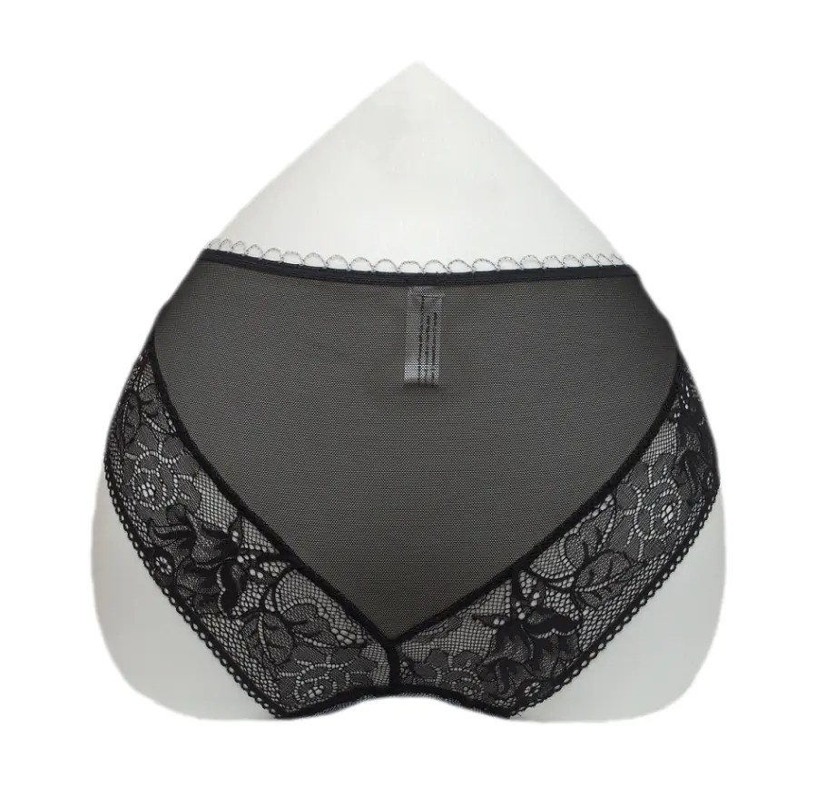 Figi pełne o klasycznym kroju wykonane z melanżowej mikrofibry oraz czarnej koronki.