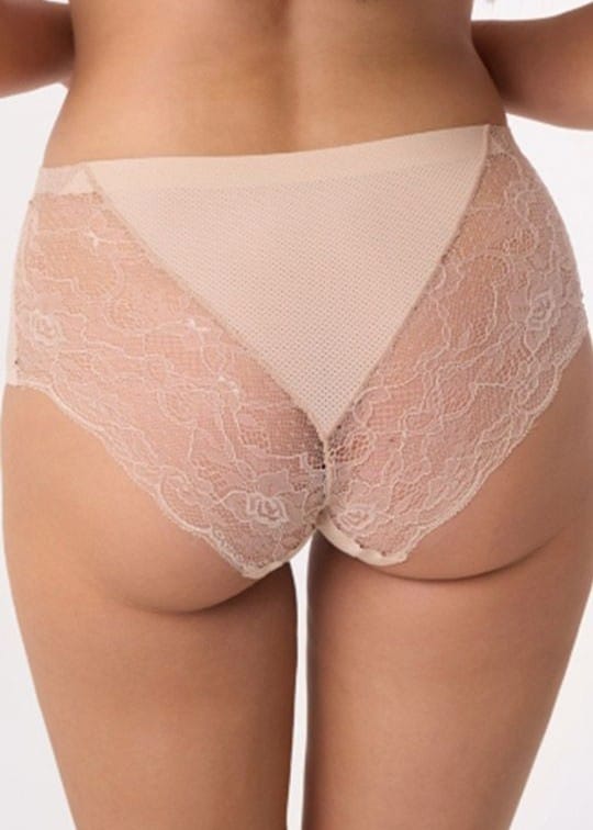 Figi z wysokim stanem łączą w sobie wyjątkowy komfort ze stylowym wyglądem oraz idealnie dopasowują się do sylwetki, podkreślając jej naturalne kształty. Tył wykonany z koronki o motywie kwiatowym. Skład: 85% poliamid, 15% elastan.