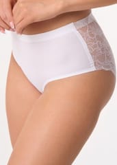 Figi z wysokim stanem łączą w sobie wyjątkowy komfort ze stylowym wyglądem oraz idealnie dopasowują się do sylwetki, podkreślając jej naturalne kształty. Tył wykonany z koronki o motywie kwiatowym. Skład: 85% poliamid, 15% elastan.
