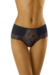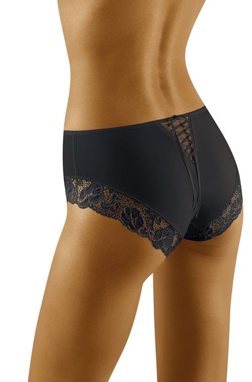 Ciekawe figi, które odróżniają się od innych. Najciekawszy akcent znajduje się z tyłu - bieliznę ozdobiono bowiem w tym miejscu kokieteryjnym, ozdobnym sznurowaniem z satynowej tasiemki. Koronkowa lamówka zdobi zarówno okolice ud, jak i większość przodu bielizny, dzięki czemu figi prezentują się niesamowicie kobieco. Skład: 83% poliamid, 17% elastan.