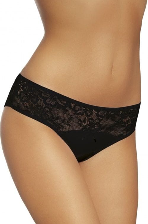 Subtelne figi wykonane z połączenia kwiecistej, elastycznej koronki i gładkiej bawełny. Góra koronkowa, z lekkim efektem prześwitu. Dół kryjący, zdobiony kokardką z przodu. Skład: 95% bawełna, 5% elastan.