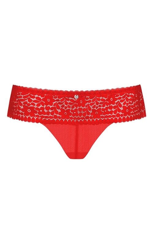 Czerwone figi zaprojektowane z myślą o sylwetkach w większym rozmiarze. Zdobione kwiecistą koronką, która zgrabnie otula biodra z obu stron. Wygodny, atrakcyjny fason. Miękka, przyjemna w dotyku dzianina. Skład: 90% poliamid, 10% elastan.