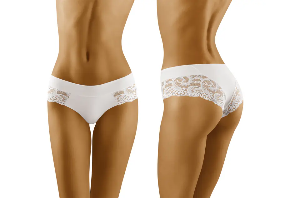 Bardzo kobiece majteczki zdobione stylową koronką, o nieco szerszych bokach, dzięki czemu delikatnie nawiązują do szortów. Linia bioder nieco obniżona, sprawia, że całość prezentuje się bardzo zgrabnie. Skład: 83% poliamid, 17% elastan.