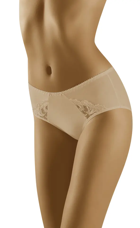 Komfortowe figi o nieco wyższym kroju z elegancko zdobionym przodem. Uda z gładkim wykończeniem, tył również gładki. Rejon talii muśnięty delikatną, piękną koronką. Skład: 90% bawełna, 7% elastan, 3% poliamid.