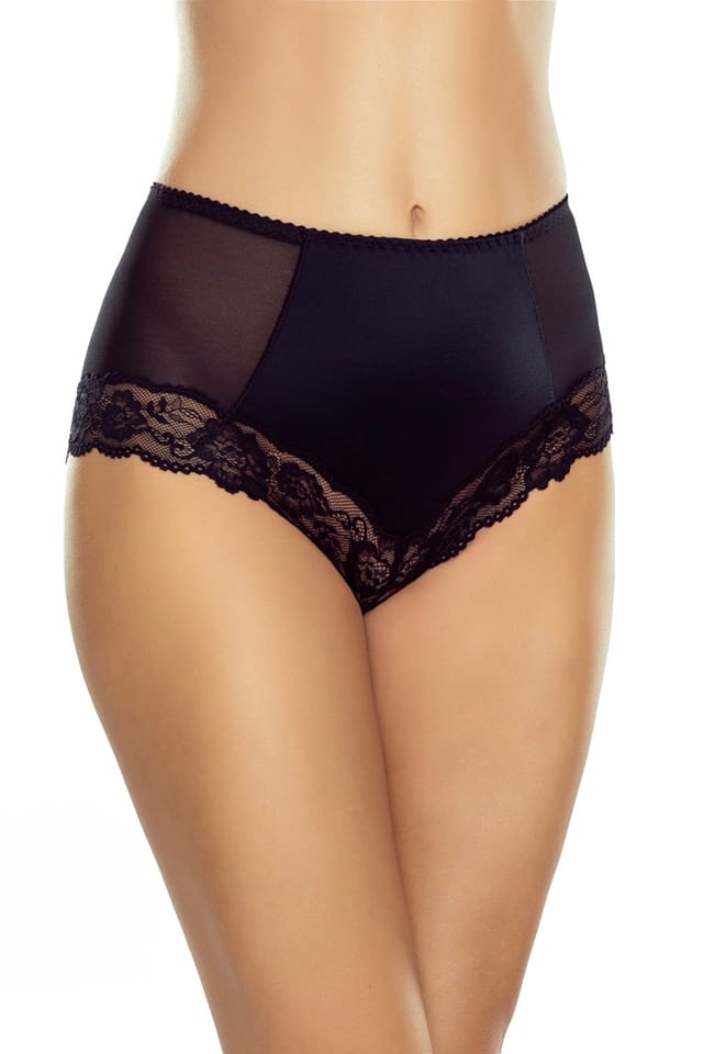 Eleganckie majtki o podwyższonym stanie z podwójną warstwą materiału z przodu, która delikatnie modeluje i wygładza brzuch. Tył i brzegi nogawek zdobi miękka koronka o płaskim wykończeniu, niewidoczna pod ubraniem. Skład:Poliamid 80%, Elastan 20%