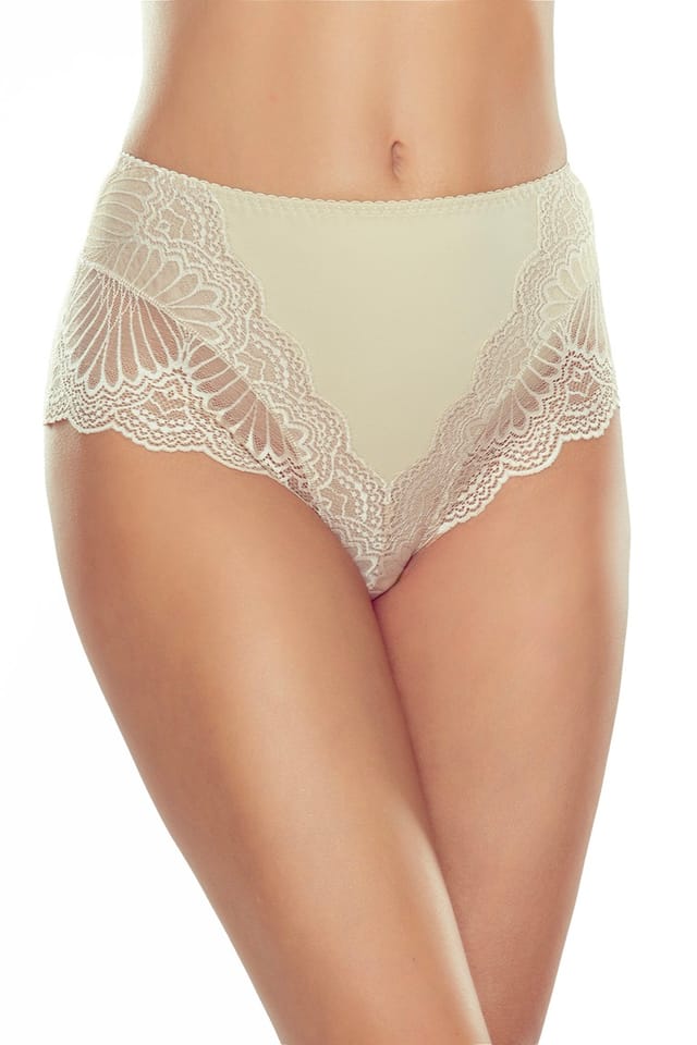 Eleganckie majtki o podwyższonym stanie z podwójną warstwą materiału z przodu, która subtelnie modeluje brzuch. Miękka koronka po bokach i z tyłu dodaje kobiecości, a jej płaskie wykończenie sprawia, że nie odznacza się. Skład:Poliamid 80%, Elastan 20%