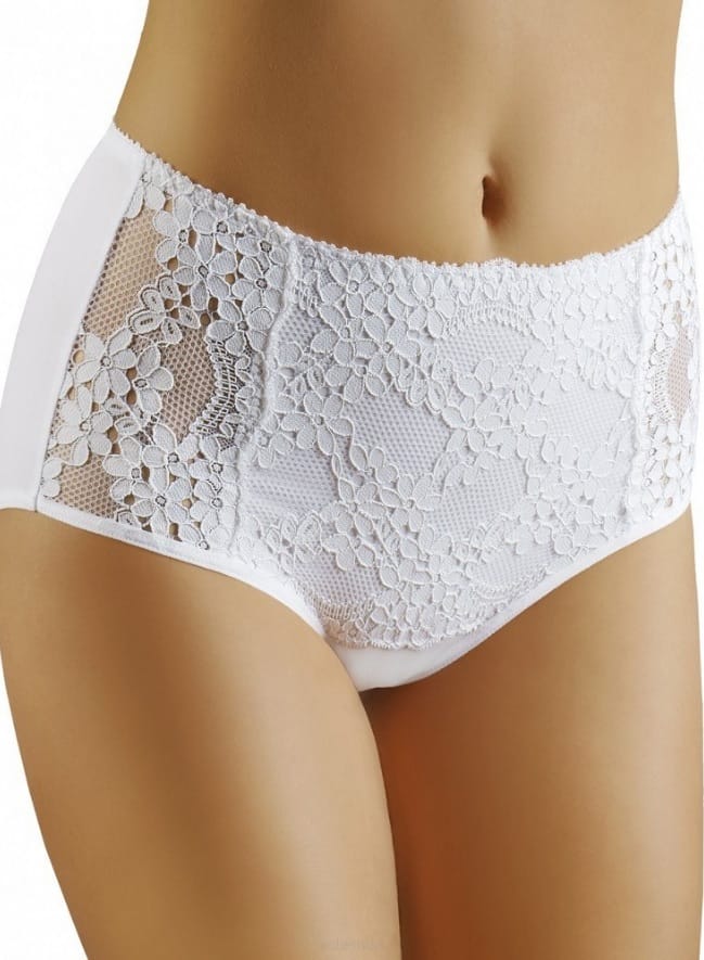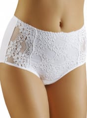 Figi damskie pełne, koronkowe, na przodzie gustowna ażurowa koronka. Po bokach bioder są lekko prześwitujące. Skład: 94% bawełna, 6% elastan.