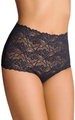 Figi damskie pełne, wysokie, wykonane z ażurowej koronki. Lekko prześwitujące. Skład: 94% bawełna, 6% elastan.