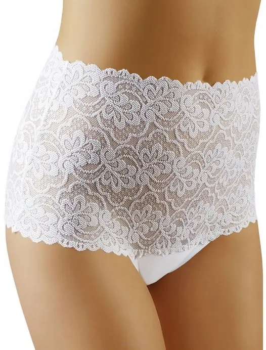 Figi damskie pełne, wysokie, wykonane z ażurowej koronki. Lekko prześwitujące. Skład: 94% bawełna, 6% elastan.