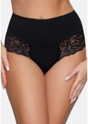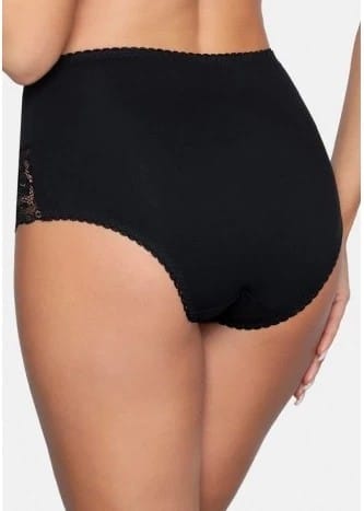 Bawełniane figi damskie o wysokiej linii talii. Zabudowane biodra, nogawki wykończone ażurowa koronką o kwiatowym motywie. Skład: 94% bawełna, 6% elastan;koronka 89% poliamid, 11% elastan.