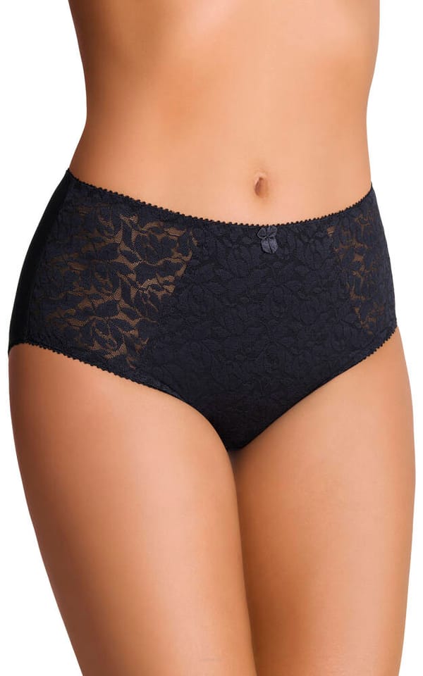 Figi damskie pełne, z wysokim stanem, wykonane z miękkiej dzianiny oraz koronki. Przód podszyty w środkowej części tkaniną modelującą brzuch. Skład: 94% bawełna, 6% elastan; koronka: 92% poliamid, 8% lycra.