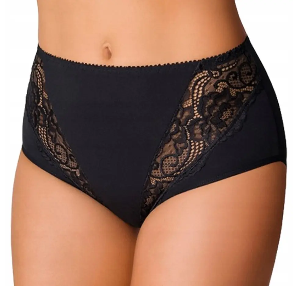 Eleganckie figi damskie wykonane z bawełny. Wykończone wyjątkową koronką. Tył w całości jest bawełniany. Skład: 94% bawełna 6% elastan.