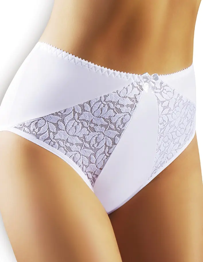 Figi damskie pełne, wysokie o zabudowanych boczkach. Z przodu wszyte dwa trójkąty z prześwitującej koronki. Skład: 94% bawełna, 6% elastan; koronka: 92% poliamid, 8% lycra.