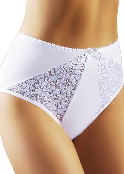 Figi damskie pełne, wysokie o zabudowanych boczkach. Z przodu wszyte dwa trójkąty z prześwitującej koronki. Skład: 94% bawełna, 6% elastan; koronka: 92% poliamid, 8% lycra.